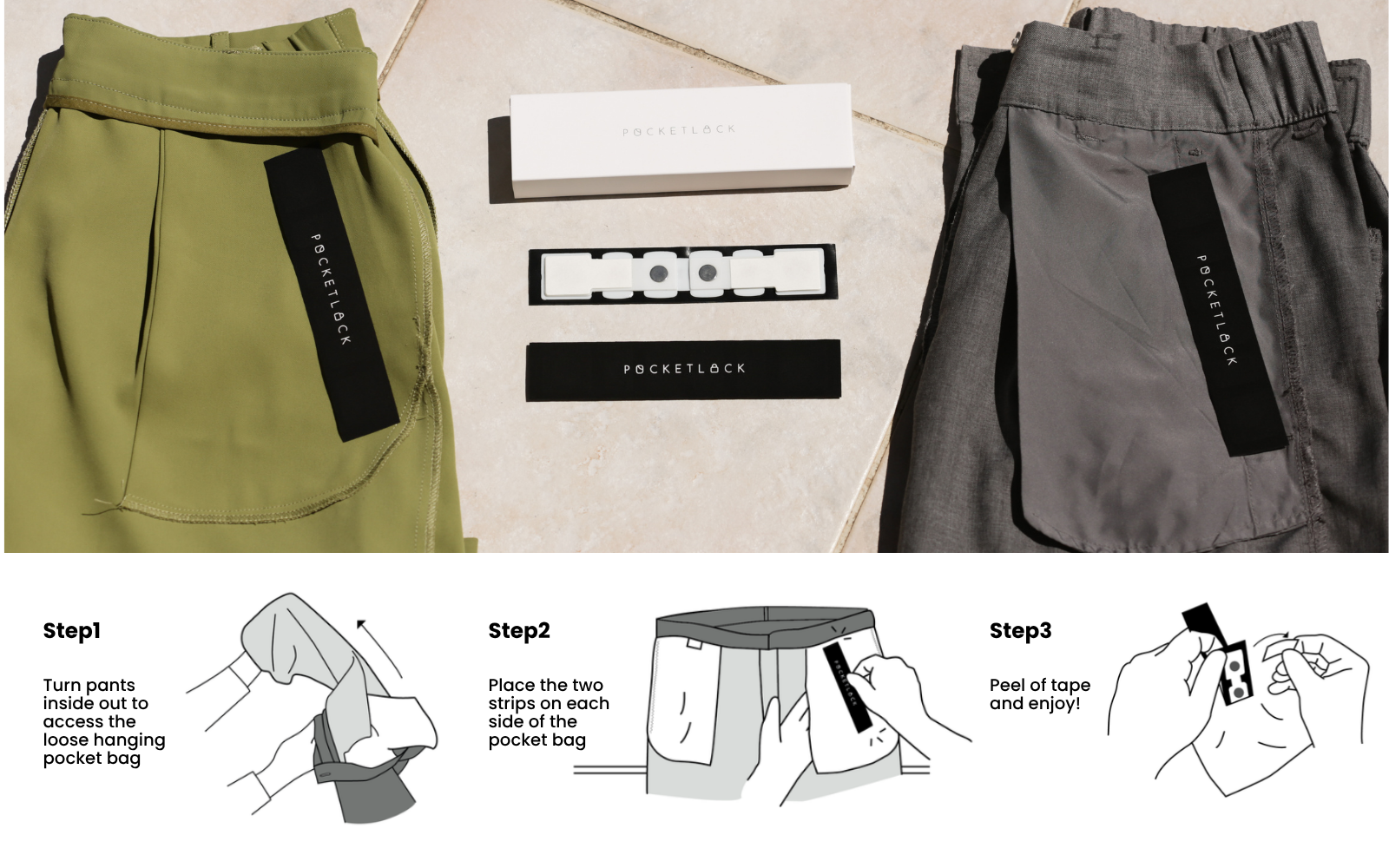PocketLock is easy to apply, and securely fastens pockets, preventing valuables from falling out, saving time and money on lost items.